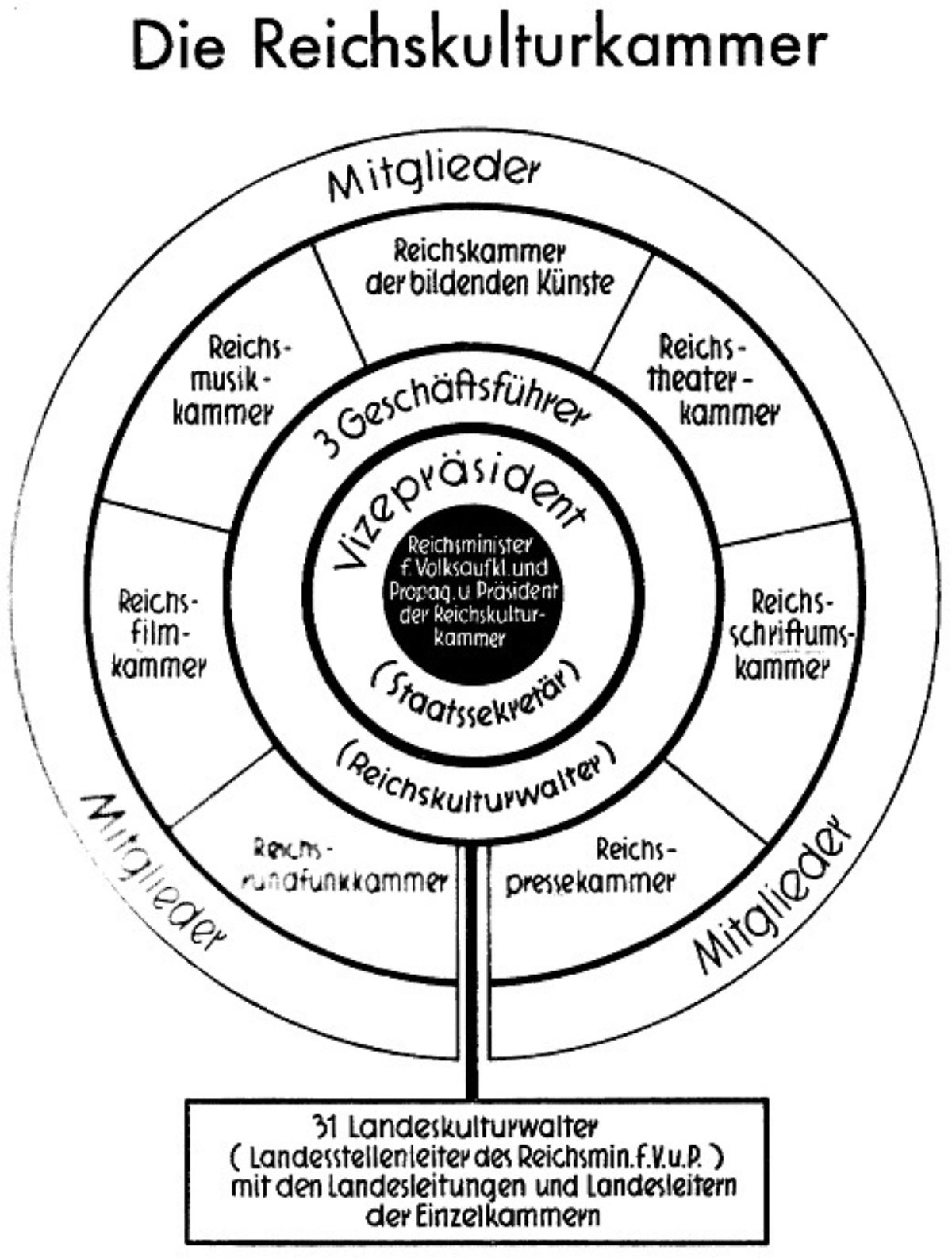 Die Reichsmusikkammer war eine Unterorganisation der im September 1933 gegründeten Reichskulturkammer (RKK), der der Propagandaminister Joseph Goebbels vorstand. Ziel der Reichskulturkammer war eine gezielte Verbreitung der NS-Ideologie über die Kultur sowie eine Kontrolle über Kunst und Kultur im Sinne des Gedankens der „Gleichschaltung". Es herrschte eine Mitgliedspflicht aller Kulturschaffenden im „Dritten Reich". Weitere Kammern stellten neben der Musik das Schrifttum, die Presse, der Rundfunk, das Theater, der Film und die Bildende Kunst dar.