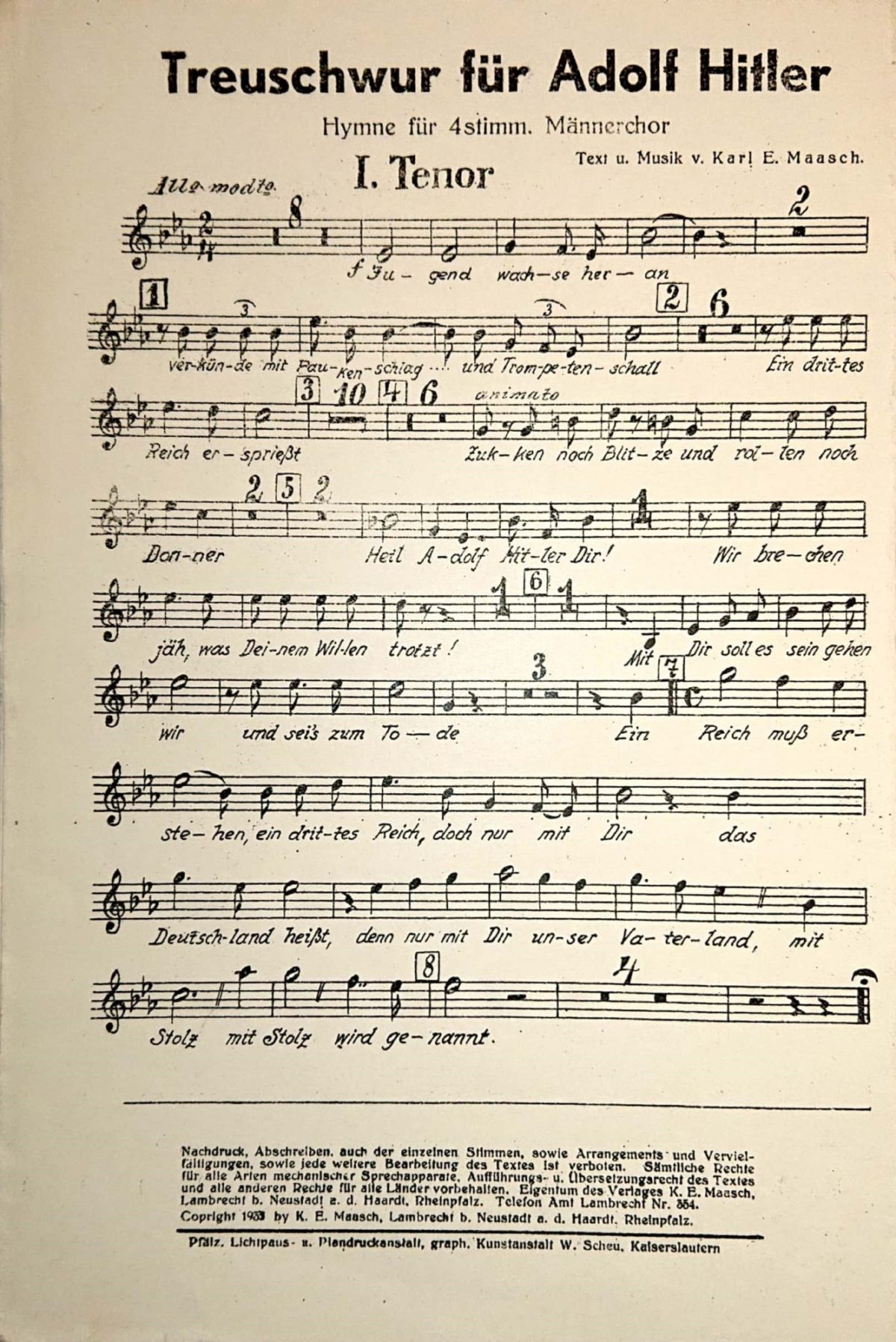 attestiert. Aufgrund des gesungenen Textes eignete sich Vokalmusik besonders gut zur Verbreitung nationalsozialistischen Gedankenguts. Auch betonten die Nationalsozialisten vielfach das gemeinschaftsstiftende Potential des chorischen Musizierens und nutzten es gezielt für eigene Zwecke. Im Zuge der „Gleichschaltung“ wurden die Neustadter Gesangvereine zwar nicht aufgelöst, aber immer stärker durch die nationalsozialistische Ideologie vereinnahmt. Unterschiedliche Organisationsinstanzen, die letztlich alle der Reichsmusikkammer untergeordnet waren, wirkten auf die Gesangvereine ein, so z. B. der „Sängergau Westmark“ als regionale Organisationsstruktur des Deutschen Sängerbundes oder auch der Städtische Musikbeauftragte. Die Nazifizierung erfolgte hierbei einerseits durch das Einwirken auf das Liedgut, indem bspw. „Gratischöre“ (kostenlose Noten) verteilt oder „(Gemeinschafts-)Pflichtchöre“ (Pflichtrepertoire) bestimmt wurden. Andererseits wurden die Neustadter Sänger, insbesondere in den Rundschreiben des dritten Städtischen Musikbeauftragten Karl Wagner, zur Teilnahme an gemeinschaftlichen musikalischen Aktivitäten, wie z. B. der Umrahmung nationalsozialistischer Feierlichkeiten, verpflichtet. Hierzu fasste Wagner oftmals alle Sänger Neustadts zu einem „Massenchor“ zusammen.
