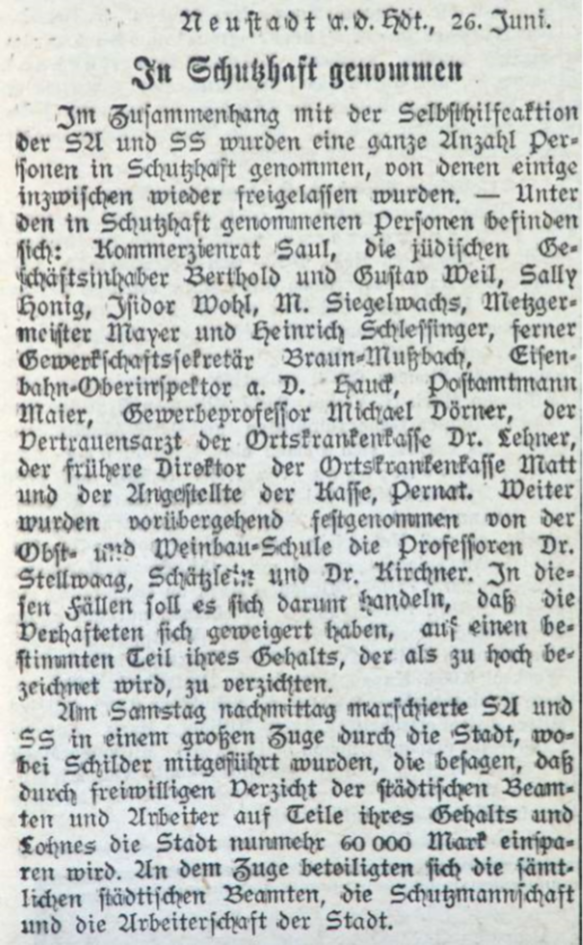 Schon 1926 war im Anzeigenteil der nationalsozialistischen Regionalzeitung „Der Eisenhammer“ zu lesen: „Kauft nur bei Deutschen!“. Es überrascht daher nur bedingt, dass die Boykottmaßnahmen des NS-Regimes gegen jüdische Betriebe in Neustadt bereits vor dem 1. April 1933 begannen. Schon ab dem 10. März wurden SA-Posten vor jüdischen Geschäften aufgestellt und Schilder an den Fensterscheiben mit dem Aufruf „Deutsche, kauft nur in Deutschen Geschäften!“ angebracht. Kurz darauf erklärte der kommissarische Bürgermeister, dass „die Neustadter deutsche Geschäftswelt sich in selbstverständlicher Weise gegen den jüdischen Geschäftswucher und Ramschwarenhandel schützt“. Am 29. März 1933 ging dann in „staatlichen und sonstigen Amtsstellen im Bereich des Regierungsbezirkes Pfalz“ ein Schreiben ein, das für das gesamte Reich den „rücksichtslose[n] Boykott der jüdischen Geschäfte“ ab dem „kommenden Samstag, den 1. April, vormittags 10 Uhr“ ankündigte. Noch im Laufe des Tages wurden die jüdischen Wirtschaftsbetriebe durch die Verhaftung des Metzgers Theodor Mayer, des Zigarettenhändlers Isidor Wohl und des Möbelhändlers Max Siegelwachs dezimiert. Dem Boykott folgten gesellschaftsspaltende Einschränkungen. So wurde bspw. der Theaterverein von Jüdinnen und Juden „gesäubert“. Sieben jüdische Mitglieder traten am 13. April 1933 aus dem Turnverein 1870 aus. Auch aus dem Neustadter Musikverein wurden jüdische Mitglieder ausgeschlossen. Im April 1933 musste Siegfried Cohrssen als langjähriger zweiter Vorsitzender und Mitbegründer des Licht-Luftbades e. V. zurücktreten. Diese ersten antisemitischen Maßnahmen gingen von Verwaltungsseite aus. Sie sind wohl nicht durch Übergriffe der Bevölkerung gekennzeichnet, wurden aber im Regelfall ebenso anstandslos hingenommen wie die zahlreichen „Schutzhaftmaßnahmen“ gegen Juden, die u. a. einen beträchtlichen Teil der Häftlinge im frühen Konzentrationslager in der vormaligen Turennekaserne ausmachten. Unter ihnen befanden sich Kommunalpolitiker wie Gustav Weil (Vorsitzender der SPD Neustadt und Stadtratsmitglied) und Leo Löb (Gemeinderatsmitglied der Deutschen Demokratischen Partei (DDP) und Dritter Bürgermeister in Haßloch).