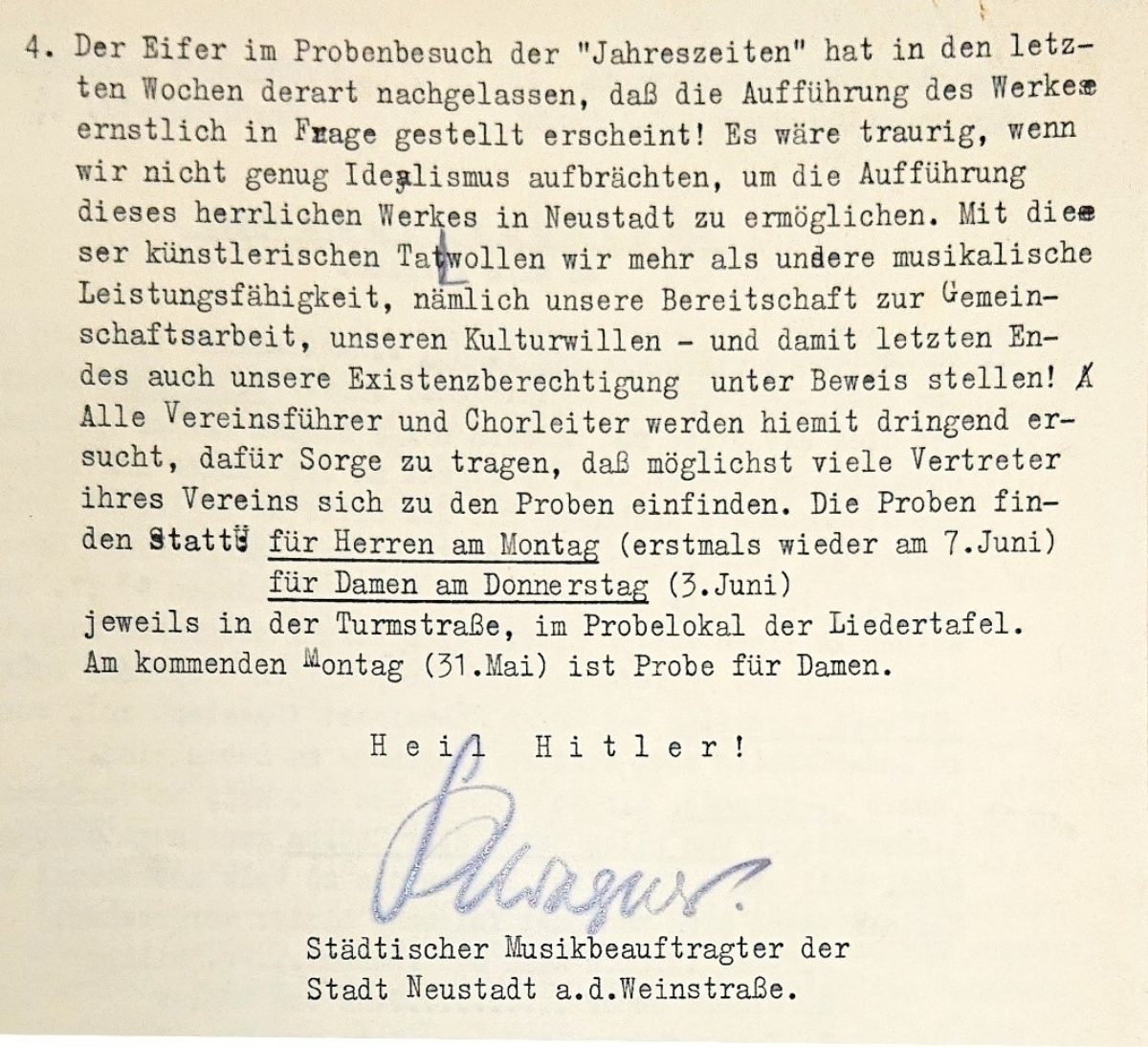 Bereits 1933 wurde mit der Einrichtung der Reichskulturkammer und ihrer „Einzelkammern“ die „Gleichschaltung“ verschiedener kultureller Bereiche (Musik, Bildende Künste, Theater, Schrifttum, Presse, Rundfunk und Film) initiiert. Mit der verpflichtenden Benennung eines Städtischen Musikbeauftragten in Städten mit mehr als 5 000 Einwohnern sollte ab 1936 die „Gleichschaltung“ des musikkulturellen Lebens auf lokaler Ebene intensiviert werden. Der Dienstanweisung für Städtische Musikbeauftragte zufolge oblag dem Amtsinhaber die Überwachung und Regelung der Organisation des Konzertlebens vor Ort. Dies sollte u. a. ermöglichen, den Bereich des Laienmusizierens (Gesangvereine, Orchester und sonstige Ensembles, die in ihrer Freizeit musizierten) stärker zu kontrollieren. Auch in Neustadt beriefen die Städtischen Musikbeauftragten hierzu zu Beginn ihrer Amtszeit jeweils einen Konzertbeirat aus Trägern des lokalen Musiklebens. Neben Vertretern verschiedener Chöre und Musikvereine selbst gehörten dem Konzertbeirat in Neustadt z. B. auch Vertreter der Reichsmusikkammer, des Deutschen Sängerbunds, der Deutschen Arbeitsfront, der NS-Kulturgemeinde, der NS-Gemeinschaft „Kraft durch Freude“, der Hitlerjugend, des Bundes Deutscher Mädel oder auch Vertreter der Industrie an. In Neustadt wurden zudem Rundschreiben genutzt, um Einfluss auf die Gestaltung des musikkulturellen Lebens auszuüben. Auf diese Weise informierte bspw. Neustadts dritter Musikbeauftragter, Karl Wagner (1937–1942), in regelmäßigen Abständen alle Laienmusiker der Stadt über geplante Projekte und verpflichtete sie zur Teilnahme an verschiedenen musikalischen Aktivitäten.