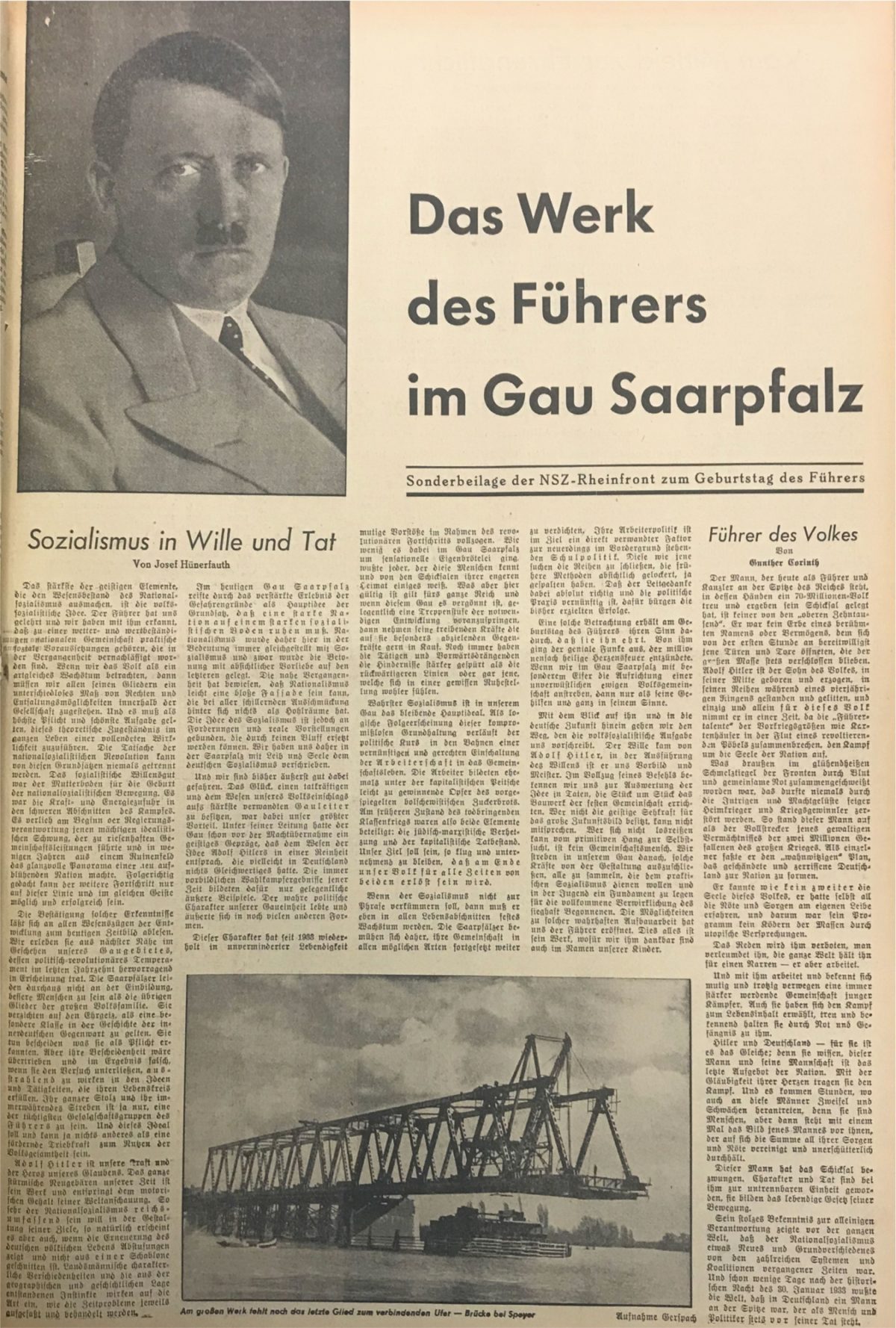 Dieter Schiffmann, Gauleiter Bürckel – ein Meister der inszenierten „Volksgemeinschaft“?, in: Pia Nordblom u. a. (Hrsg.), Josef Bürckel. Nationalsozialistische Herrschaft und Gefolgschaft in der Pfalz. Kaiserslautern 2019, 153–168. Zeigt an Beispielen, inwiefern die sozialpolitischen Maßnahmen wirksam waren und welche Ambitionen der Gauleiter damit eigentlich verfolgte.