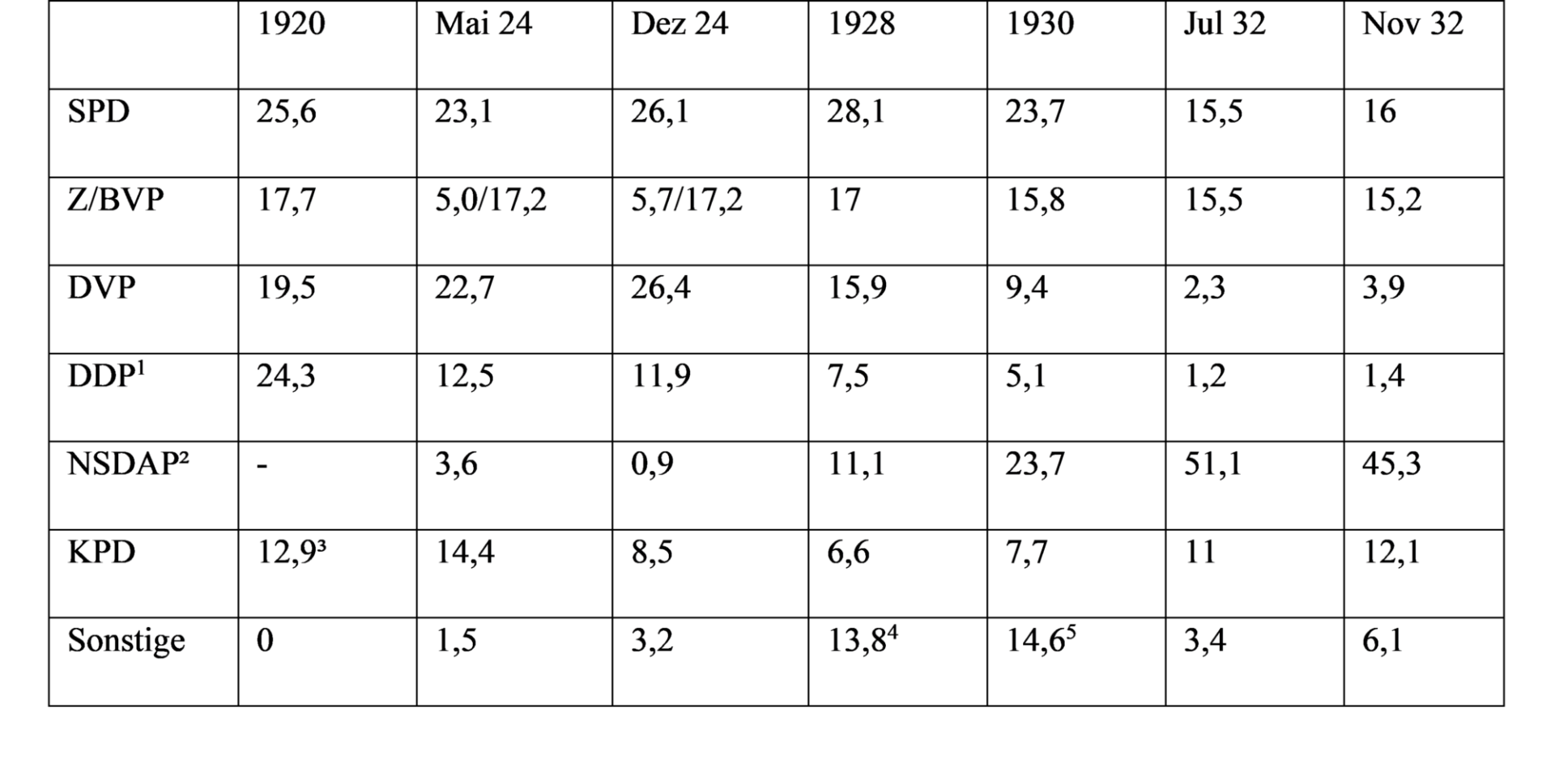 5 darunter: Reichspartei des deutschen Mittelstands (Wirtschaftspartei): ca. 8,4 Prozent; Christlich-sozialer Volksdienst: ca. 2,9 Prozent; DNVP: ca. 1,4 Prozent.