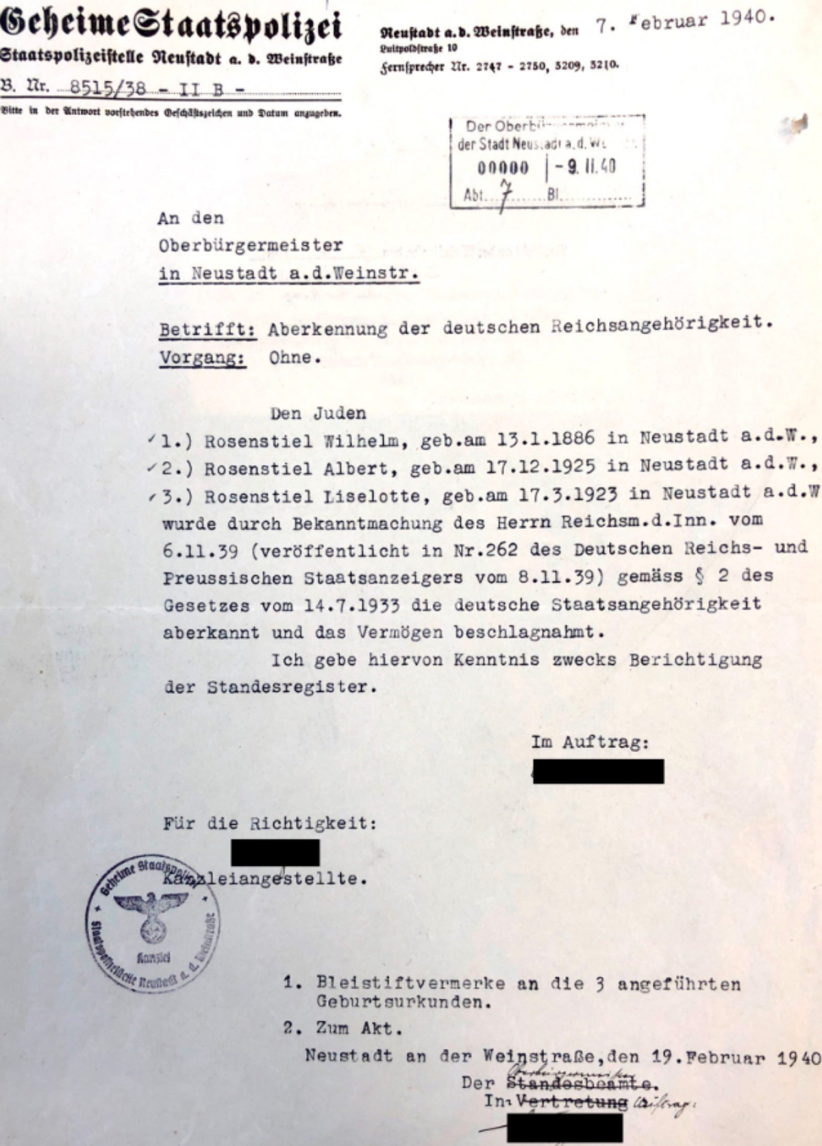 Landesarchiv Speyer J6 12073, 12453, 13763. Restitutionsakten der Rosenstiel.