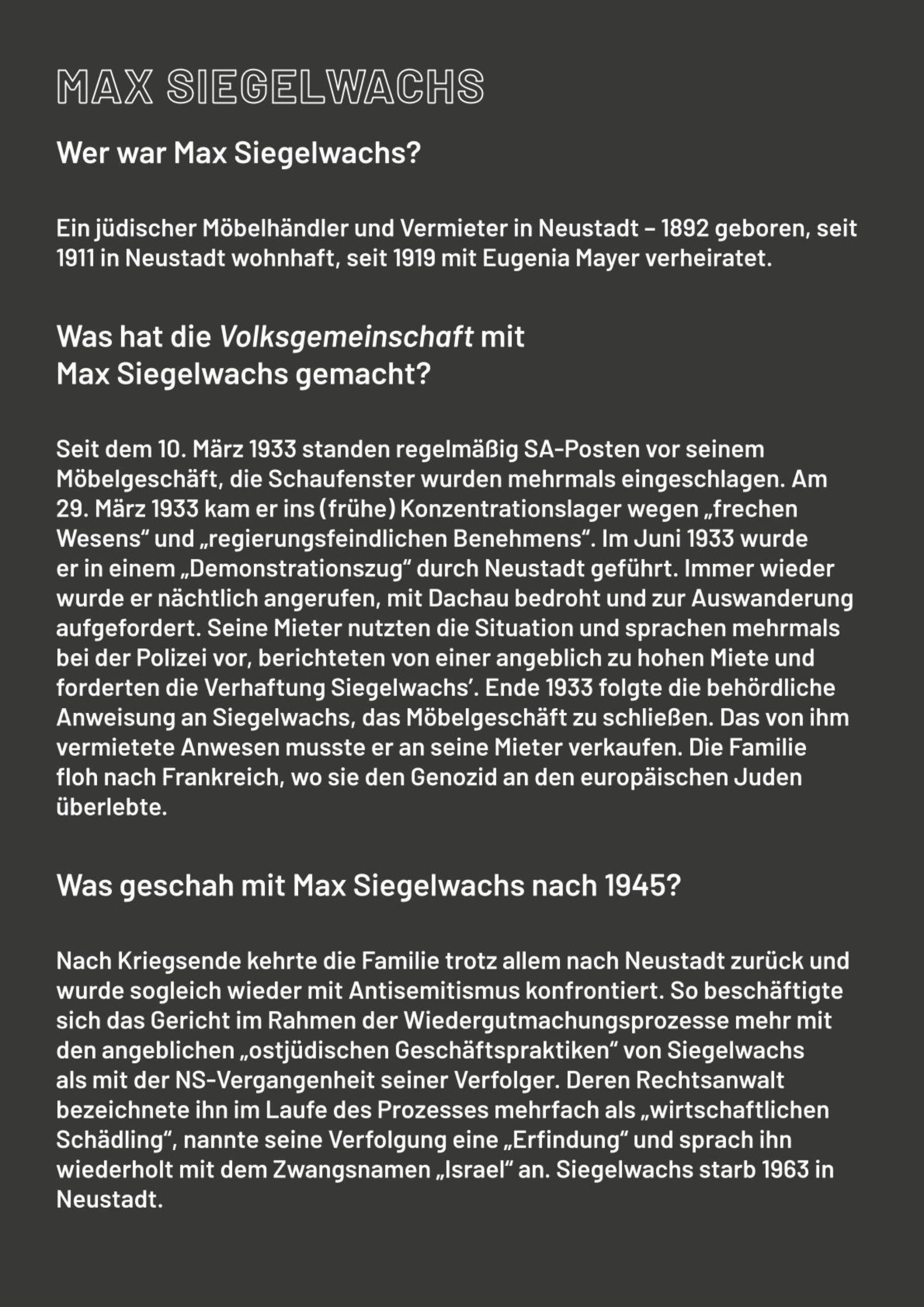 M6: Die 2020 im Rahmen einer Ausstellung erstellten Biografien von Max Siegelwachs sowie Hans und Hermann Keil Jr.