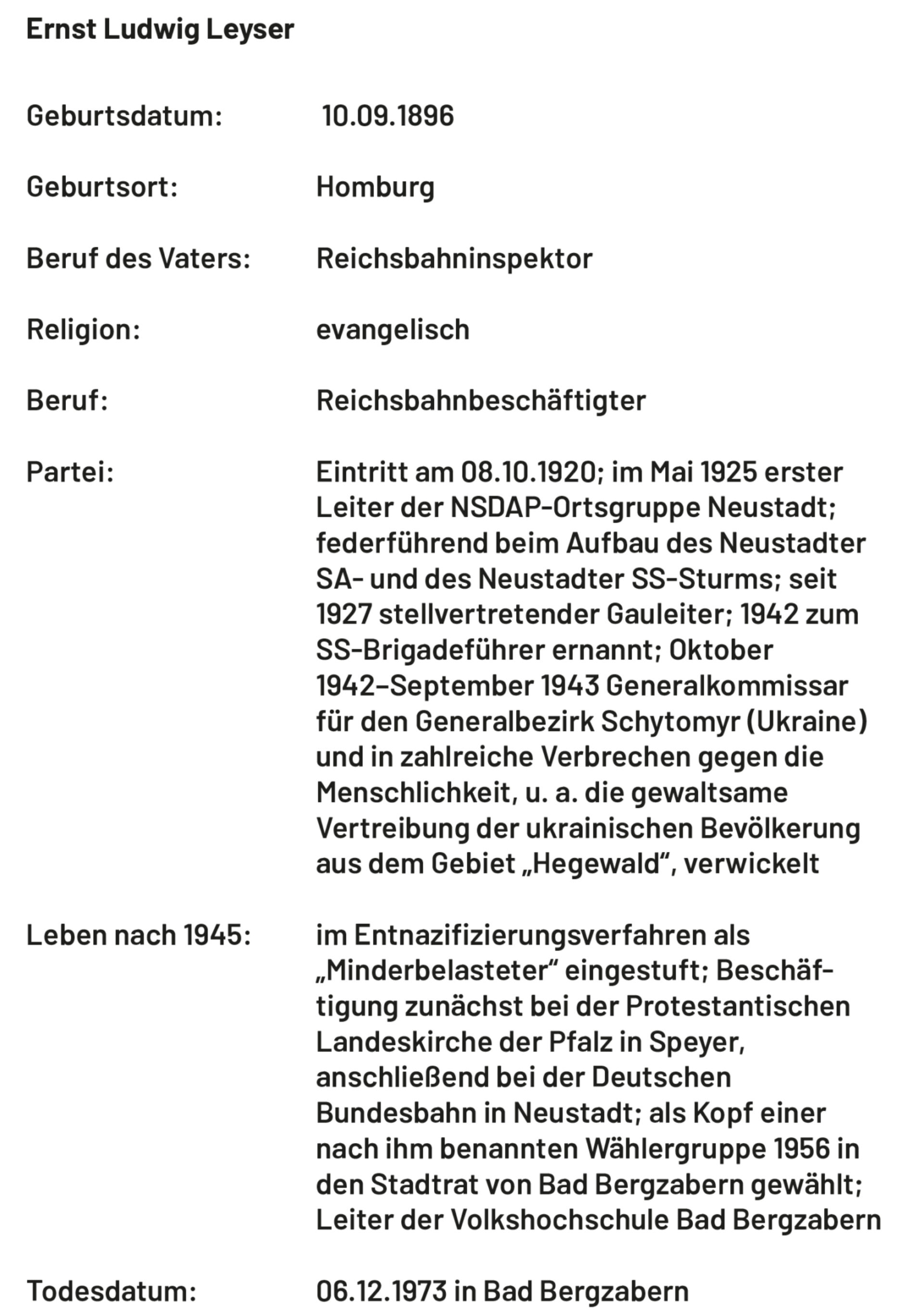 Was würde ein Neustadter des Jahres 1950, eine Neustadterin des Jahres 1975 dazu sagen? Solche Fragen sind nicht unwichtig, wenn man verstehen will, wie unsere Gesellschaft zu dem wurde, was sie heute ist, und welchen Weg sie vielleicht in der Zukunft einschlagen könnte. Im Folgenden soll daher der Umgang mit der NS-Vergangenheit im Blickpunkt stehen. Der Fall Neustadt erscheint dabei besonders interessant: Immerhin erhielt die ehemalige Gauhauptstadt erst durch den Nationalsozialismus ihren Beinamen „an der Weinstraße“ und in etlicher Hinsicht erlangte sie erst durch ihn ihre heutige kulturelle Bedeutung. Wie also hat sich die lokale Erinnerung an die NS-Zeit von 1945 bis heute verändert? Und wie lassen sich diese Veränderungen erklären?