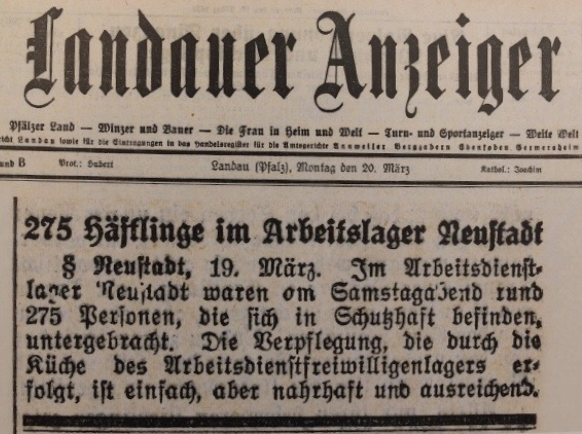 In der Nacht vom 9./10. März 1933 übernahm die NSDAP in Bayern und somit auch in großen Teilen der Pfalz die Regierungsgewalt. In der Folge wurden alle politischen und gesellschaftlichen Institutionen schrittweise „gleichgeschaltet". Dieses Ereignis ging einerseits mit öffentlichen Feierlichkeiten und der Zustimmung vieler Menschen einher, läutete jedoch zugleich auch die organisierte Verfolgung politischer Gegner*innen der Nationalsozialisten ein. Auch in Neustadt wurden NSDAP-Kritiker*innen in „Schutzhaft“ genommen und in dem am 10. März 1933 errichteten, (frühen) Konzentrationslager untergebracht, den Gebäuden der ehemaligen Turenne-Kaserne auf dem Weg nach Speyerdorf.