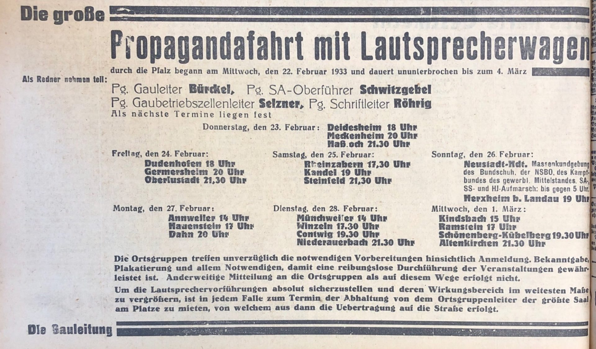 M5: Zeitungsartikel zur Wahlkampftätigkeit der Bayerischen Volkspartei vor den Märzwahlen 1933 in Neustadt