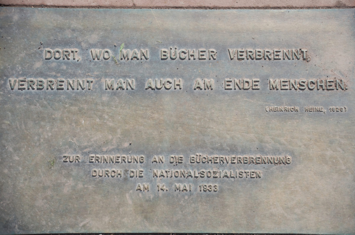 Aufschrift: „Dort, wo man Bücher verbrennt, verbrennt man auch am Ende Menschen“. (Heinrich Heine, 1820). Zur Erinnerung an die Bücherverbrennung durch die Nationalsozialisten am 14. Mai 1933.