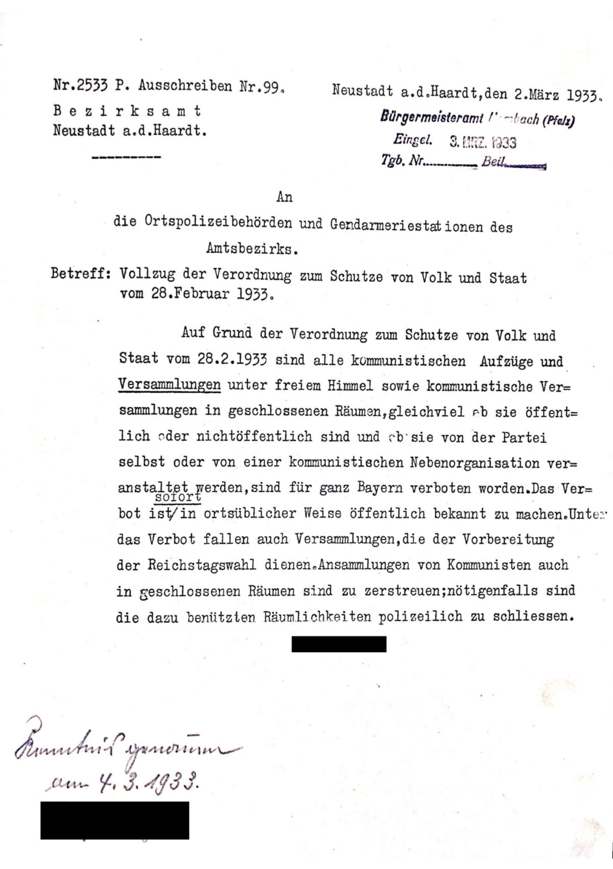 M3: Schreiben an die Ortspolizei Neustadt vom 2. März 1933 zum Vollzug der „Verordnung zum Schutze von Volk und Staat“ vom 28. Februar 1933
