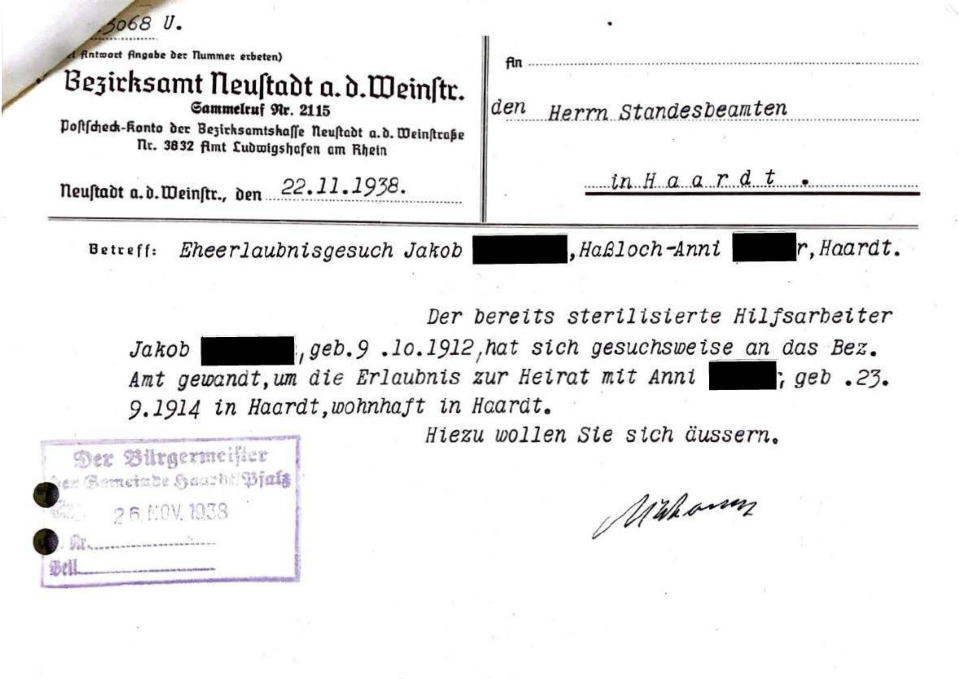 Die Partner*innenwahl ist für uns heute eine Privatsache. Von Rechts wegen haben grundsätzlich alle Bundesbürger*innen die Möglichkeit, die Partnerin oder den Partner frei zu wählen. Innerhalb einer Ehe kann das Paar entscheiden, wer arbeiten geht, wer sich um die Kindererziehung kümmert und wie die Erziehung gestaltet werden soll. Einschränkungen dieser elterlichen Freiheiten durch den Staat gibt es vor allem dann, wenn die Erziehung durch die Eltern nicht dem Wohl des Kindes dient. Diese rechtliche Freiheit hat sich historisch entwickelt und ist keineswegs eine Selbstverständlichkeit. Zur Zeit des Nationalsozialismus galt die Familie als „Keimzelle der Sippe und des Volkes“ und somit als zentraler Bestandteil der Volksgemeinschaft. Ihr kam eine große ideologische Bedeutung zu. Ab 1935 gab es beispielsweise gesetzliche Eheverbote zwischen „Volksgenossen" und Juden*Jüdinnen, die mit der Ideologie der „Rassenhygiene"1 begründet wurden. 1938 wurde das Scheidungsrecht für sogenannte „Fehlehen" gelockert. Als „Fehlehen" galten kinderlose Partnerschaften.