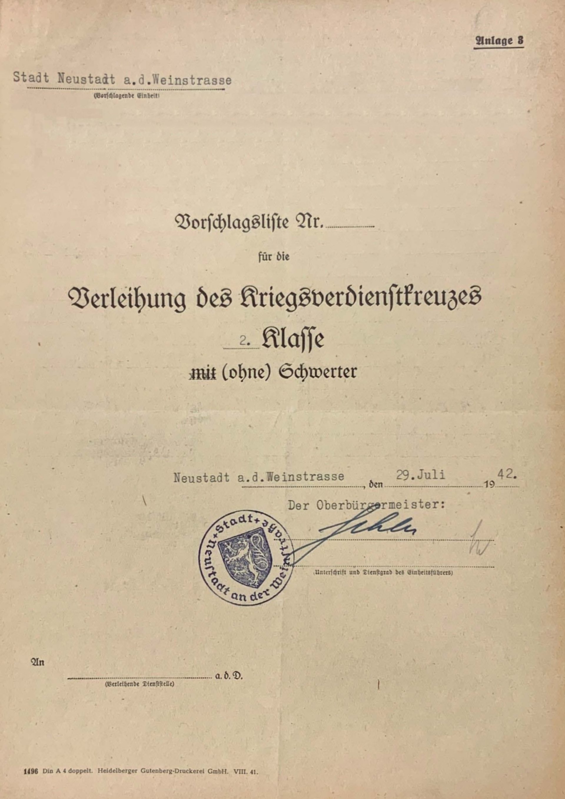 M9: Antrag zur Vergabe des Kriegsverdienstkreuzes (2. Klasse) an die Haßlocherin Else Lätsch 1943/44