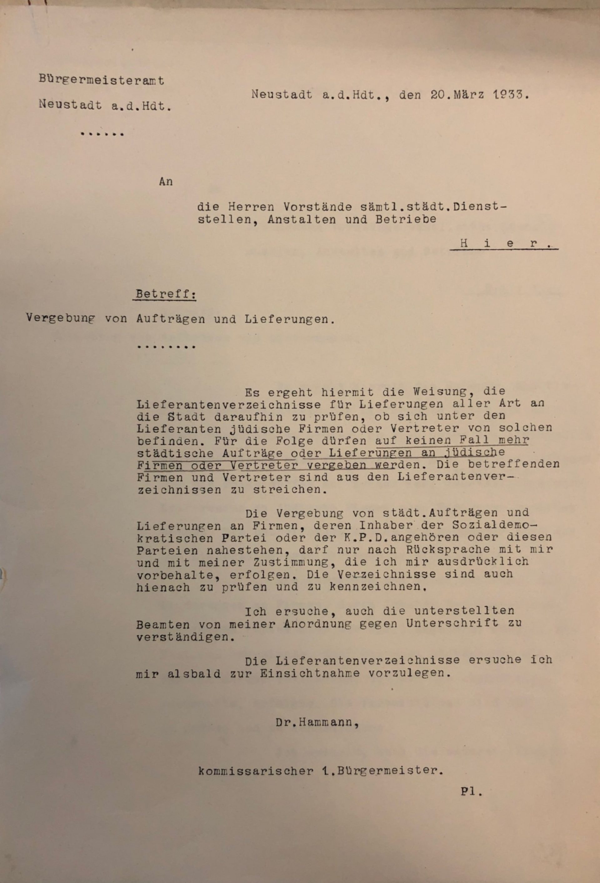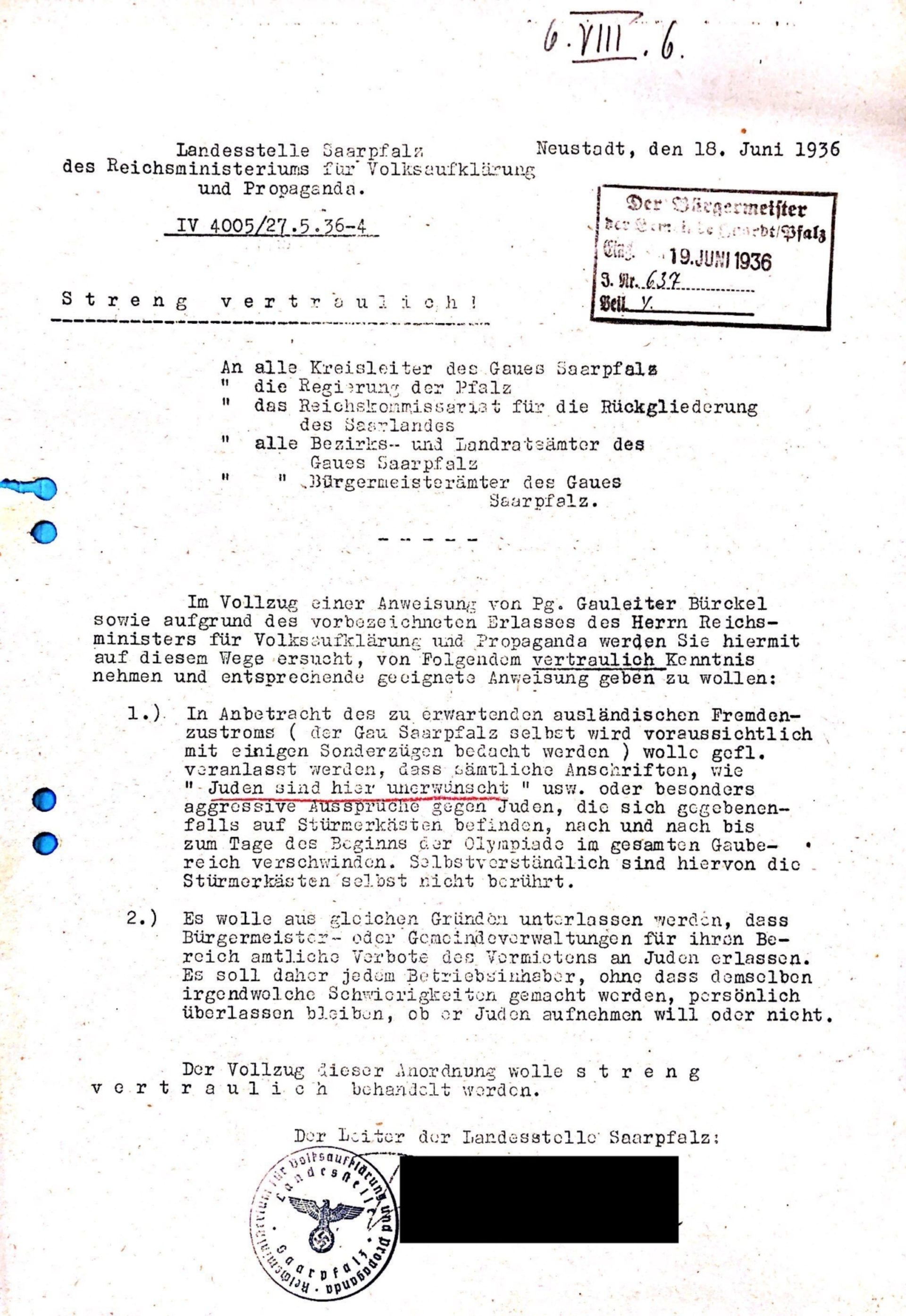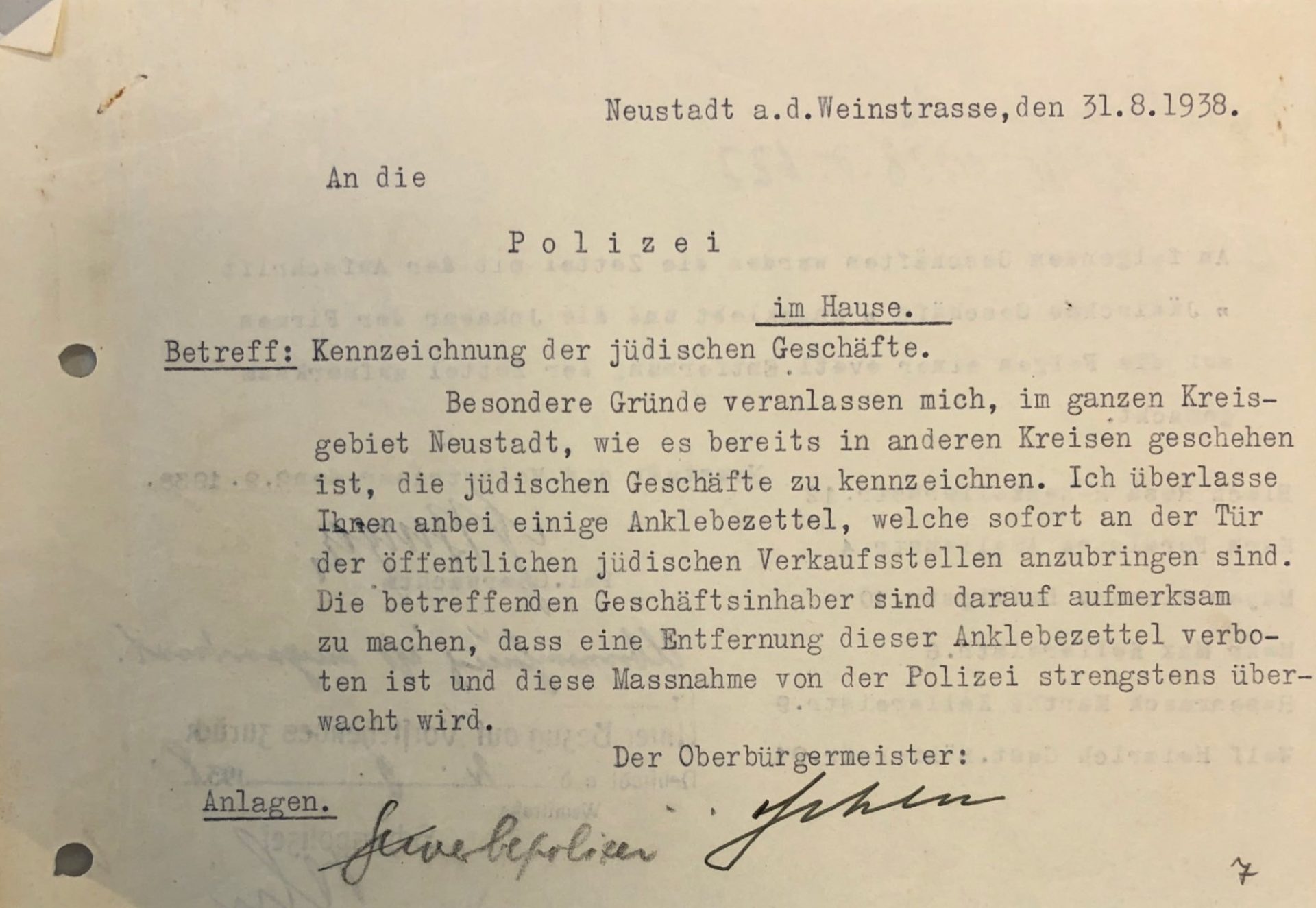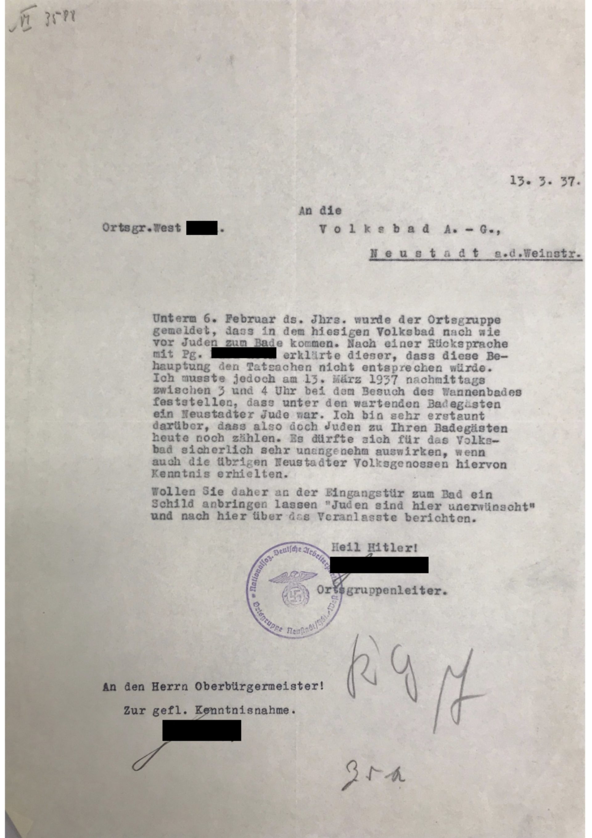 Die Ausgrenzung war offen ausgesprochener Bestandteil der Ideologie, die damit an ältere Formen der Judenfeindschaft anknüpfte. Schon vor 1933 waren diese antisemitischen Töne in Teilen der Gesellschaft lauter geworden. Auch jüdische Kinder und Jugendliche mussten sich zunehmend mit Vorurteilen, persönlichen Nachteilen und öffentlich gelebter Ausgrenzung auseinandersetzen. Mit der sogenannten „Machtergreifung“ im Jahr 1933 nahm die gesellschaftliche und politische Exklusion1 bedeutend zu und führte schließlich von der Verfolgung zu den systematischen Deportationen in die Arbeits- und Vernichtungslager. Die in Neustadt besonders ausgeprägten Boykottaktionen gegen jüdische Geschäfte waren nur äußerer Ausdruck einer spürbaren Veränderung der Lebenswelten. In der Nacht vom 9. auf den 10. November 1938 wurden die Synagoge und das jüdische Altersheim von Mitgliedern der SA und SS angezündet. Bei dem Brand starben zwei Bewohnerinnen des Altersheims, Camilla Haas und Fanny Bender. 1940 schließlich wurden mindestens 23 der in Neustadt-Stadt verbliebenen Jüdinnen und Juden im Rahmen der „Bürckel-Wagner-Aktion“, die die gesamte Saarpfalz und Baden betraf, in das Internierungslager nach Gurs deportiert. Für rund die Hälfte von ihnen stellte das südfranzösische Gurs eine Zwischenstation vor Deportationen in weitere Vernichtungslager dar.