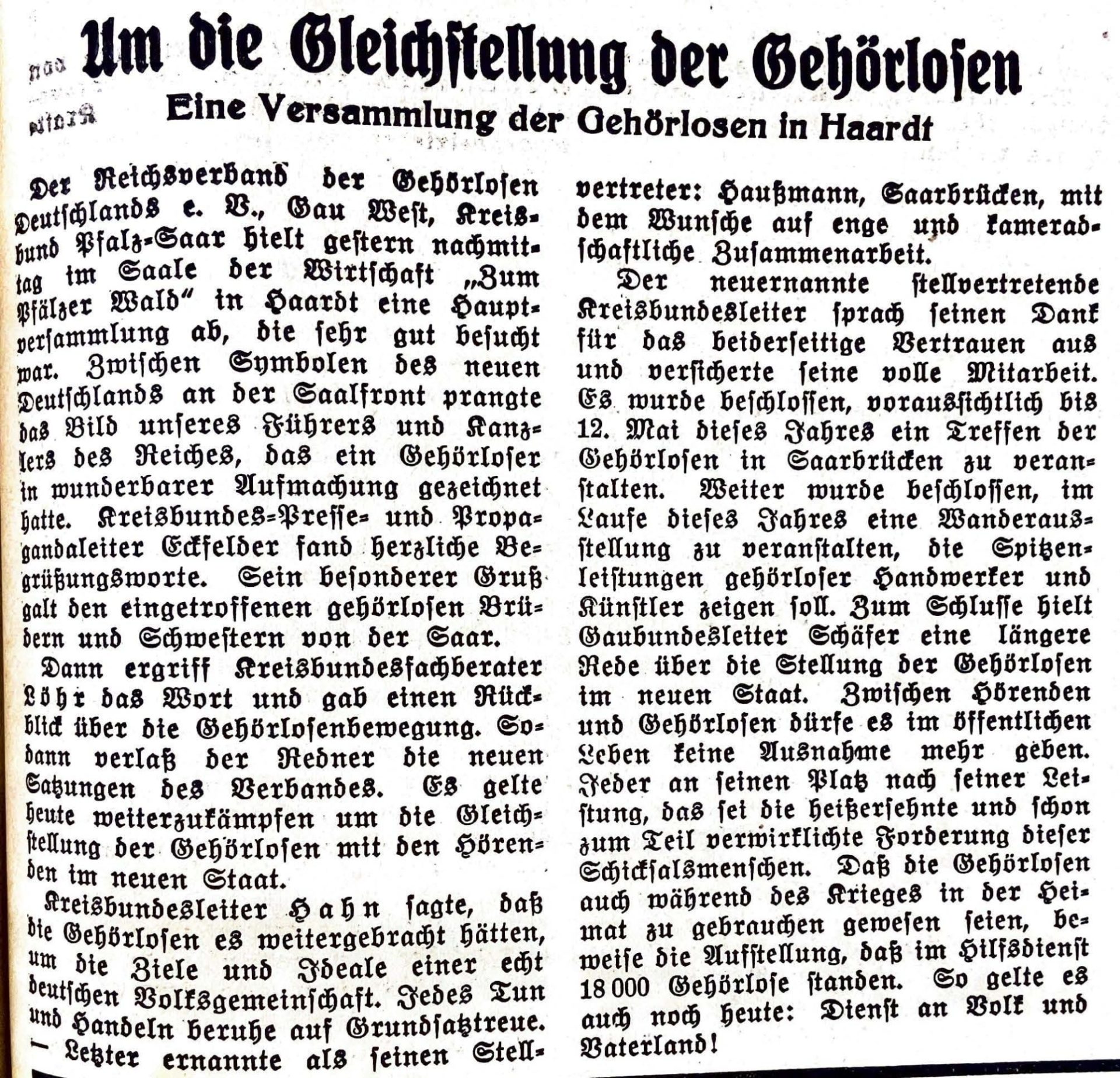 Es wurde beschlossen, […] im Laufe dieses Jahres eine Wanderausstellung zu veranstalten, die Spitzenleistungen gehörloser Handwerker und Künstler zeigen soll. Zum Schlusse hielt Gaubundesleiter Schäfer eine längere Rede über die Stellung der Gehörlosen im neuen Staat. Zwischen Hörenden und Gehörlosen dürfe es im öffentlichen Leben keine Ausnahme mehr geben. Jeder an seinen Platz nach seiner Leistung, das sei die Heißersehnte und schon zum Teil verwirklichte Forderung dieser Schicksalsmenschen. Daß die Gehörlosen auch während des Krieges in der Heimat zu gebrauchen gewesen seien, beweise die Aufstellung, daß im Hilfsdienst13 18 000 Gehörlose standen. So gelte es auch noch heute: Dienst an Volk und Vaterland!