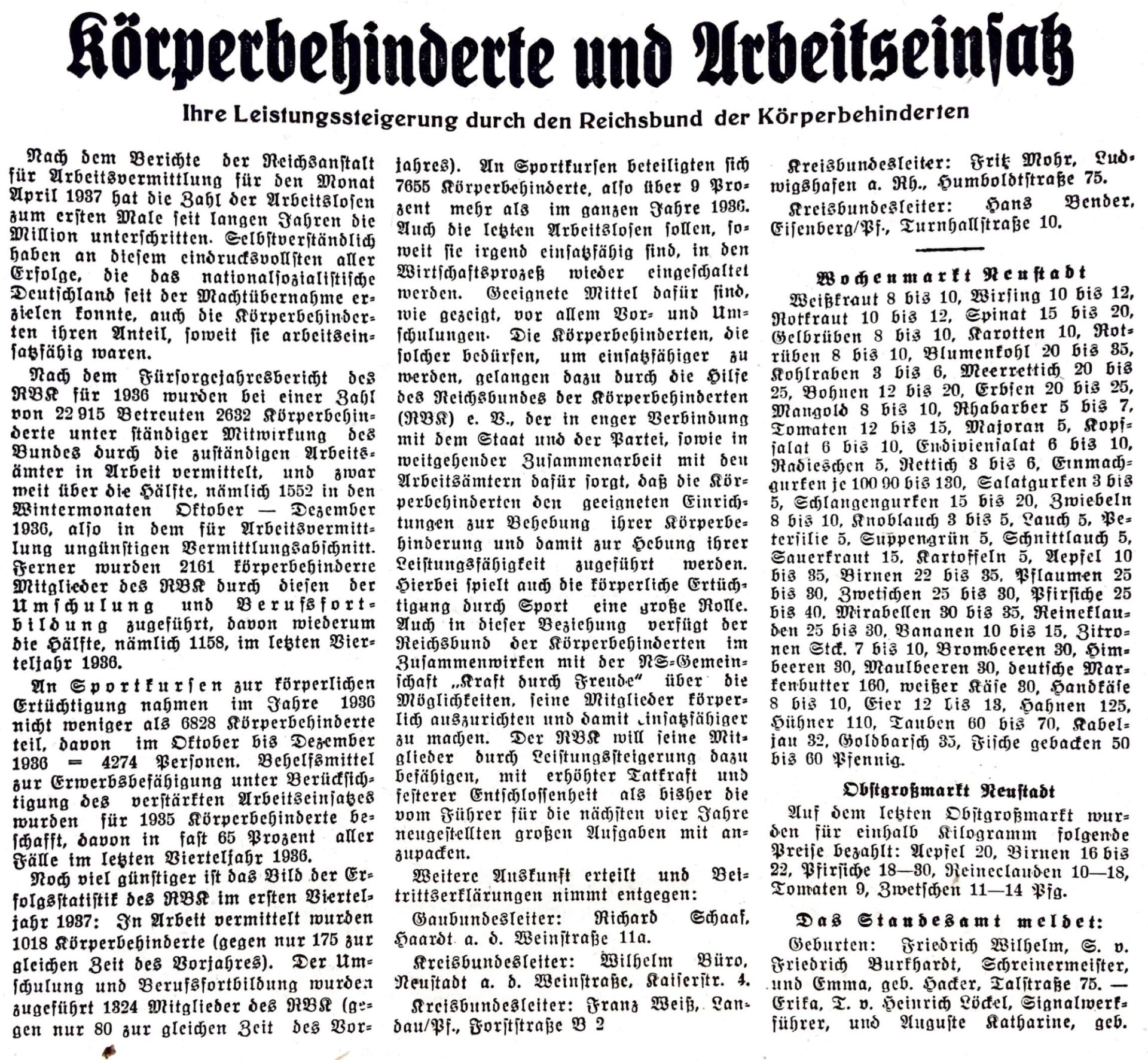 Nach dem Berichte der Reichanstalt für die Arbeitsvermittlung14 für den Monat April 1937 hat die Zahl der Arbeitslosen zum ersten Male seit langen Jahren die Million unterschritten. Selbstverständlich haben an diesem eindrucksvollsten aller Erfolge, die das nationalsozialistische Deutschland seit der Machtübernahme erzielen konnte, auch die Körperbehinderten ihren Anteil, soweit sie arbeitseinsatzfähig waren. […] Auch die letzten Arbeitslosen sollen, soweit sie irgend einsatzfähig sind, in den Wirtschaftsprozess wieder eingeschaltet werden. […] Die Köperbehinderten, die solcher bedürfen, um einsatzfähiger zu werden, gelangen dazu durch die Hilfe des Reichsbundes der Körperbehinderten (RBK) e.V.15, der in enger Verbindung mit dem Staat und der Partei, sowie in weitgehender Zusammenarbeit mit den Arbeitsämtern dafür sorgt, daß die Körperbehinderten den geeigneten Einrichtungen zur Behebung ihrer Körperbehinderung und damit zur Hebung ihrer Leistungsfähigkeit zugeführt werden. […]