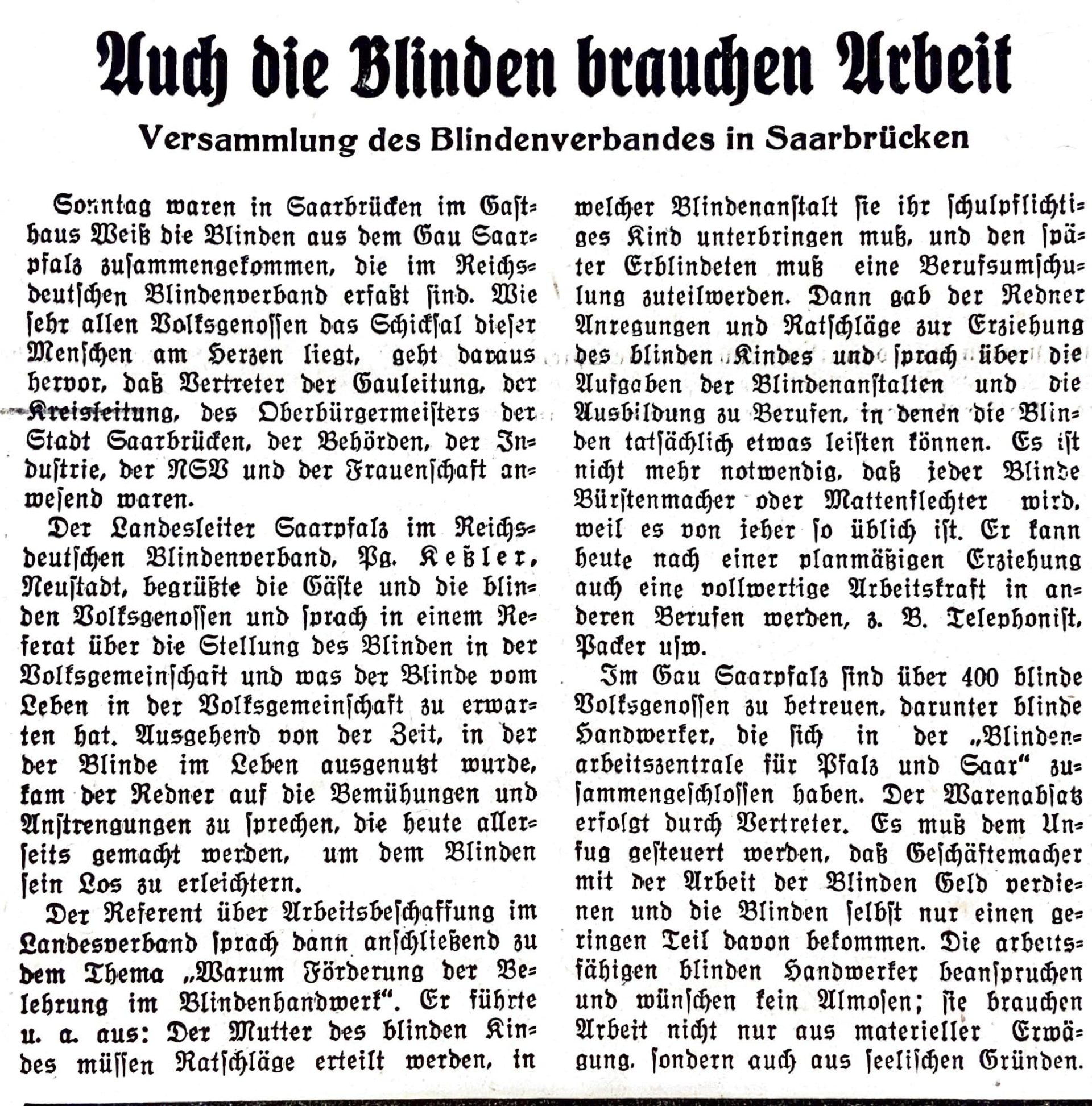 Der Landesleiter Saarpfalz im Reichsdeutschen Blindenverband, P[arteigenosse] Keßler, Neustadt, begrüßte die Gäste und die blinden Volksgenossen und sprach in einem Referat über die Stellung des Blinden in der Volksgemeinschaft und was der Blinde vom Leben in der Volksgemeinschaft zu erwarten hat. […]