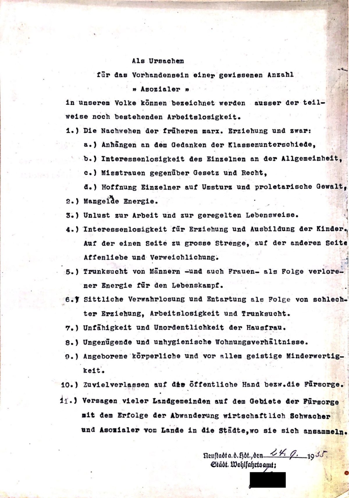M9: Die Historikerin Miriam Breß beschreibt die Gründe sozialrassistisch motivierter Verfolgungen in Neustadt und Umgebung in einer Veröffentlichung im Jahr 2020