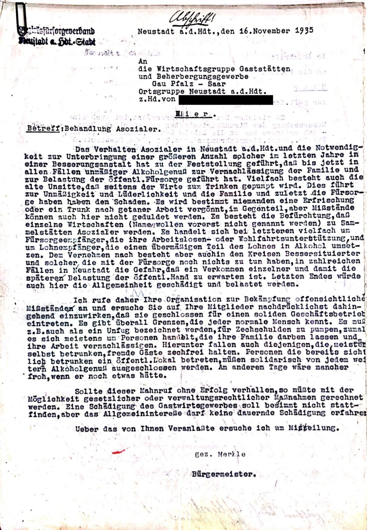 M12: Schreiben des Bürgermeisters Hieronymus Merkle an die Wirtschaftsgruppe der Gaststätten in Neustadt vom 16. November 1935