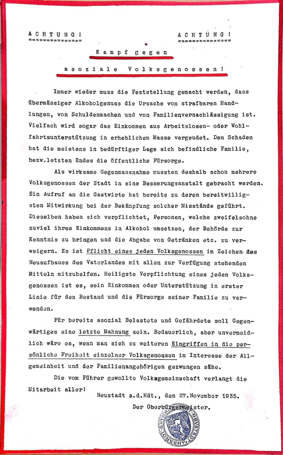Am 18. August 2006 trat in der Bundesrepublik Deutschland das „Allgemeine Gleichbehandlungsgesetz" in Kraft, das auch als Antidiskriminierungsgesetz bezeichnet wird. Ziel des Gesetzes ist es, „Benachteiligungen aus Gründen der Rasse oder wegen der ethnischen Herkunft, des Geschlechts, der Religion oder Weltanschauung, einer Behinderung, des Alters oder der sexuellen Identität" zu verhindern und zu beseitigen. Das Gesetz zielt auf die Abschaffung von Ungerechtigkeiten innerhalb der Gesellschaft. Das NS-Regime verfolgte in dieser Hinsicht grundlegend andere Ziele. Darum soll es in diesem Unterkapitel gehen: Nach der Volksgemeinschafts-Ideologie blieben verschiedene „Gruppierungen" aus der heraufbeschworenen „Gemeinschaft“ ausgeschlossen. Zu ihnen gehörten Menschen mit (vermeintlicher) Behinderung, sogenannte „Asoziale“ und „homosexuelle" Männer. Sie stehen im Folgenden im Fokus. Die Auswahl gerade dieser „Gruppen" erfolgte unter anderem basierend auf der Neustadter Quellenlage. Zu anderen „Verfolgtengruppen" wie den Sinti und Roma oder Zeug*innen Jehovas ist die Quellenlage lückenhaft, sodass hier umfängliche historische Deutungen kaum möglich sind.
