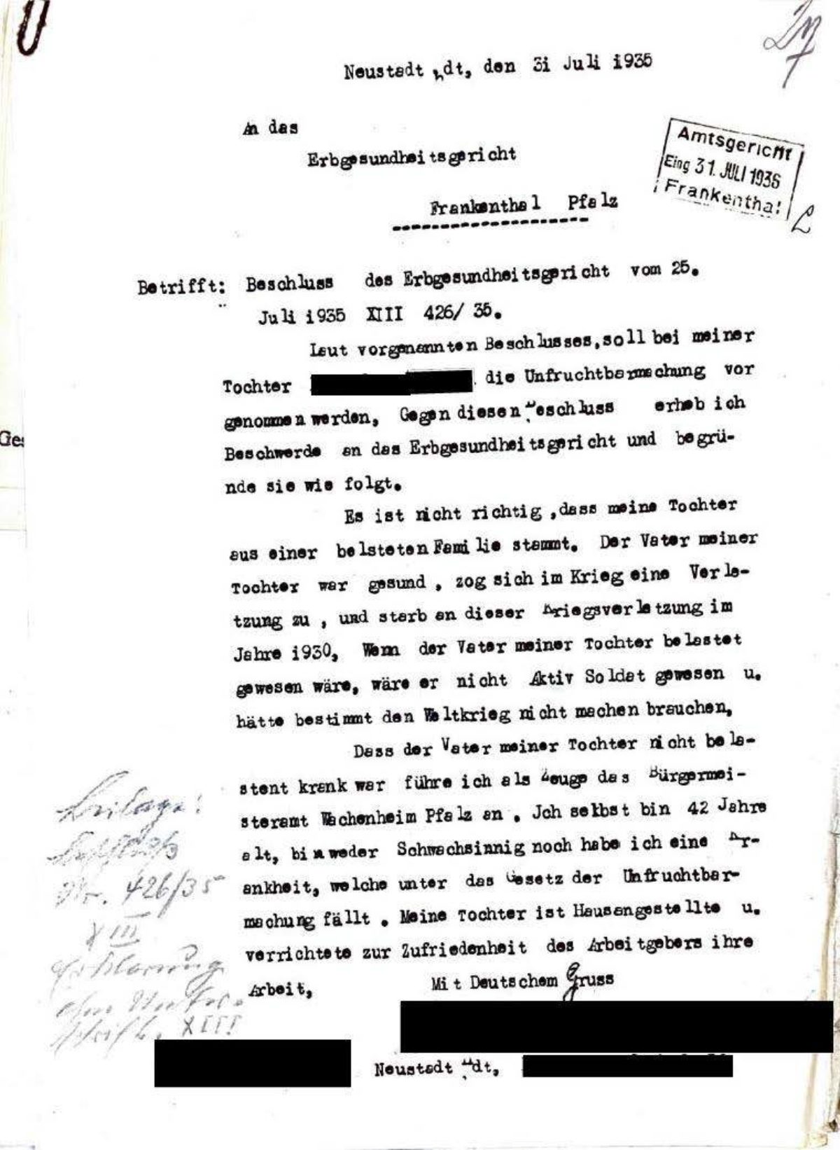 M3: Beschwerde der Mutter von Sophie K. [pseudonymisiert] über den Beschluss zur Unfruchtbarmachung ihrer Tochter gegenüber dem Erbgesundheitsgericht in Frankenthal vom 31. Juli 1935