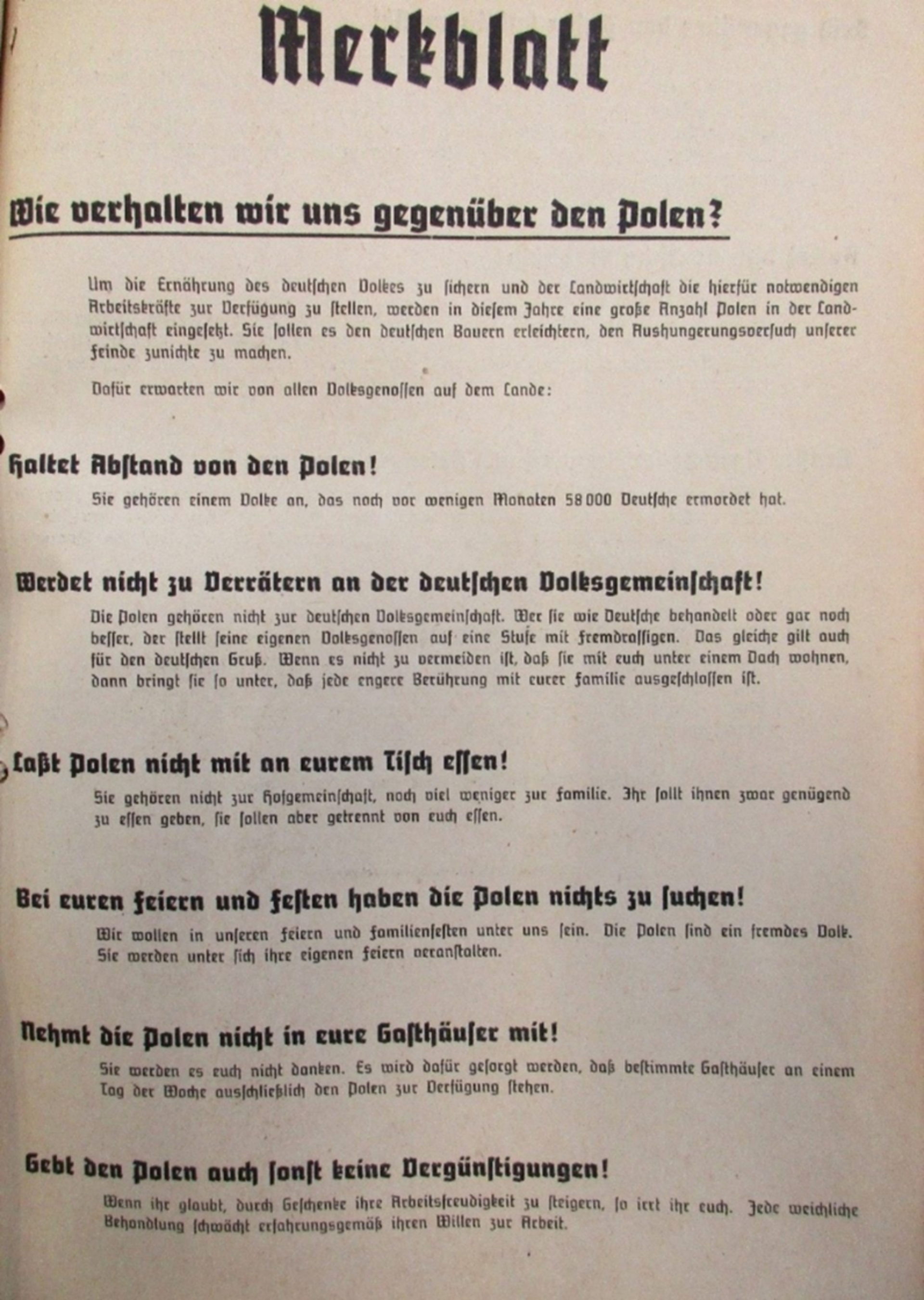 Die Polen gehören nicht zur deutschen Volksgemeinschaft. Wer sie wie Deutsche behandelt oder gar noch besser, der stellt seine eigenen Volksgenossen auf eine Stufe mit Fremdrassigen. Das gleiche gilt auch für den deutschen Gruß. Wenn es nicht zu vermeiden ist, daß sie mit euch unter einem Dach wohnen, dann bringt sie so unter, daß jede engere Berührung mit eurer Familie ausgeschlossen ist.